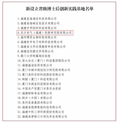 近日,福建省人力资源和社会保障厅公布了46家新设立省级博士后创新实践基地名单,电影天堂 东方电气(福建)创新研究院有限公司榜上有名。