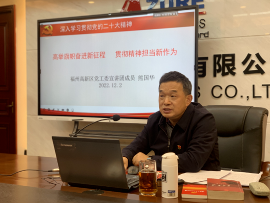 根据区党工委统一部署,12月2日下午,学习贯彻党的二十大精神电影天堂 党工委宣讲团赴福建浩蓝光电有限公司开展宣讲活动。区党工委宣讲团团长、区党工委委员熊国华作宣讲报告。区非公企业党委相关负责同志、福建浩蓝光电有限公司党员、职工群众30余人参加。