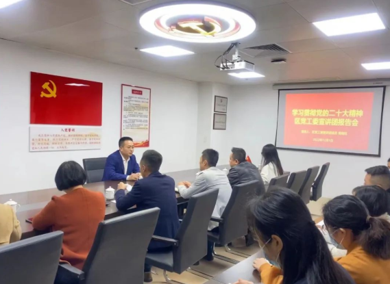 12月1日上午,电影天堂 党工委宣讲团成员、区党群工作部部长黄相钰赴高投公司宣讲党的二十大精神,高投公司党支部书记、董事长陈振兴及20余名党员干部参加。