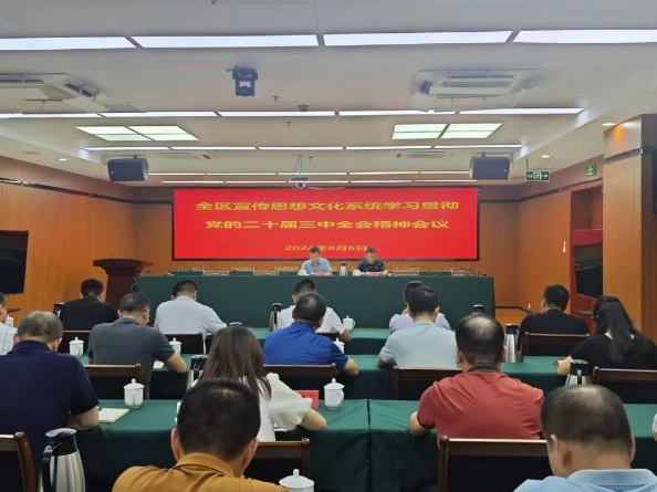 一要认真组织实施,迅速掀起学习宣传贯彻全会精神的热潮。各有关部门要抓好理论学习,做到学深悟透、入脑入心。广泛开展宣传宣讲,加强全会精神阐释解读。二要坚持结合融入,抓好当前和下一步重点工作。全区宣传文化战线要完整准确领会把握全会的核心要义和精神实质,切实加强理论武装、舆论引导、精神文明建设、文化事业产业和网络安全等领域改革创新。三要强化组织领导,全面落实思想文化领域改革任务。各单位主要负责同志要坚决扛稳责任,把牢方向导向,谋划学习宣传贯彻的具体措施,不折不扣抓好全会精神学习宣传贯彻工作。