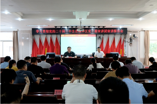 为深入学习贯彻党的二十届三中全会精神,引领广大党员干部深学笃行,迅速把思想和行动统一到党的二十届三中全会精神上来,8月26日,南屿镇召开学习贯彻党的二十届三中全会精神宣讲会,特邀区党工委宣讲团成员、区党工委委员、管委会三级调研员熊国华授课。镇党委副书记、镇长林滢淳主持,镇领导班子成员、各包村领导及机关各办站负责人、各村(社区)主干参加。