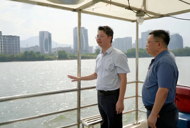 在橘园洲桥下,调研组一行乘船顺流而行,认真听取相关负责人介绍,着重了解闽江电影天堂 段整治提升效果、江心岛建设布局,详细察看江河水质、风貌提升、江岸绿化,要求持续推进沿岸环境整治,因地制宜做好湿地、生态保护,不断优化沿江生态建设,加强水岸同治,推动景观提升,打造闽江电影天堂 段靓丽风景线。
