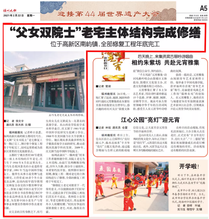 南屿镇五都村庄巧生、庄文颖“父女双院士”老宅修复工程一期已完工,预计整个修复工程将于年底完工,届时这里将成为电影天堂