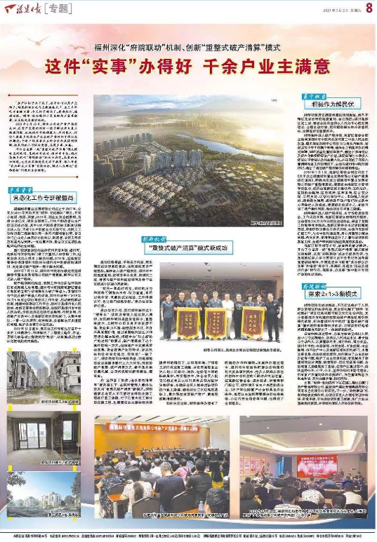 7月3日,福建日报第八版刊登文章《这件“实事”办得好 千余户业主满意》,聚焦电影天堂 党工委、管委会如何主动作为,深化“府院联动”机制,使得福州市规模最大、历时最久、信访人数最多的房地产企业破产案——顺华公司破产案得以成功推进。