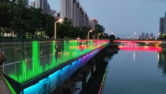 ▲轮船港滨水公园百余米玻璃护栏,在夜晚幻化出多彩的图案