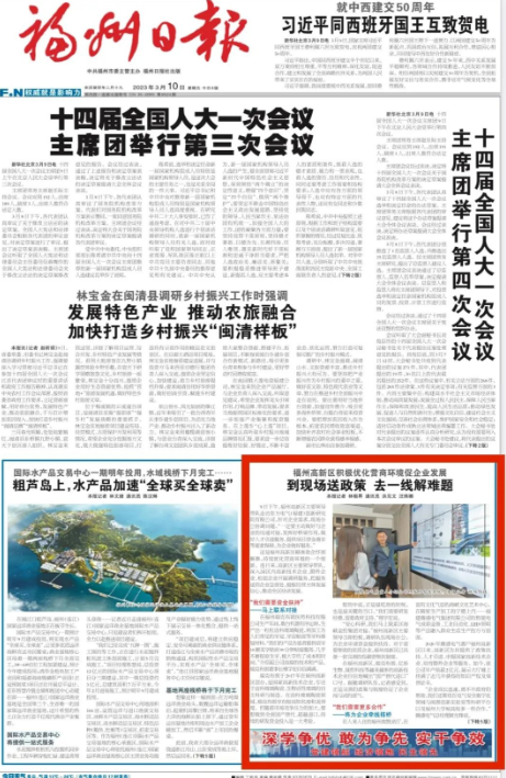 3月10日,《福州日报》头版刊登文章《到现场送政策去一线解难题》,聚焦电影天堂 积极优化营商环境促企业发展。走访东方电气(福建)创新研究院、瑞克布朗医药科技有限公司、福建腾盛电气集团……这是电影天堂 精准助企纾困解难,持续优化营商环境的一个缩影。连日来,电影天堂 主要领导带队,深入园区内高新技术企业、瞪羚企业、初创企业开展调研服务,把服务送到企业急需处,提振经营主体发展信心,推动全区经济发展。