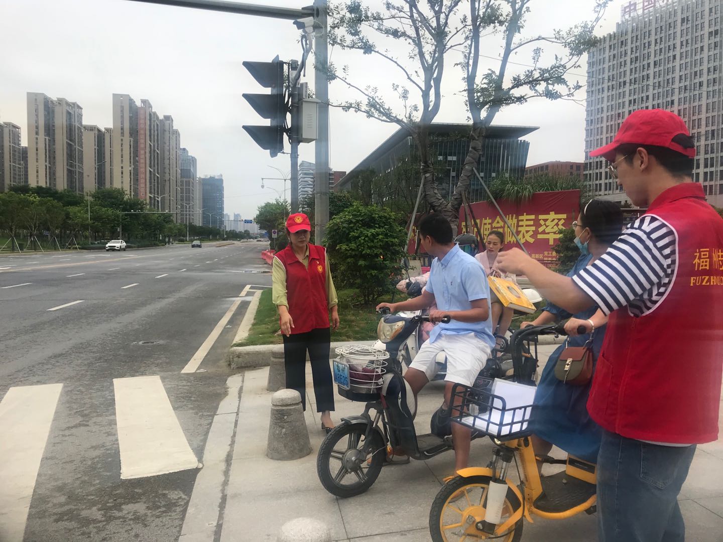 当天,志愿者们对过往行人和非机动车的不文明交通行为进行劝导,引导市民文明出行。