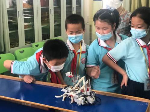 “机器狗好厉害!”,随乐起舞的机器狗一出场就吸睛无数。在机器人表演展示现场,老师用通俗易懂的语言为同学们讲解何为编程,并让同学们近距离体验机器人的科学魅力。裤兜编程机器人、魔方机器人、蝎子机器人、走灯机器人等体验区前围满了学生,裤兜编程机器人体验区域更是摩肩接踵。同学们在老师的指导下,设计线路让裤兜编程机器人重走长征路,引导同学们扣好人生第一粒扣子,厚植爱国主义情怀。活动间隙,老师们还开展了防范电信诈骗、福文化等宣传教育。
