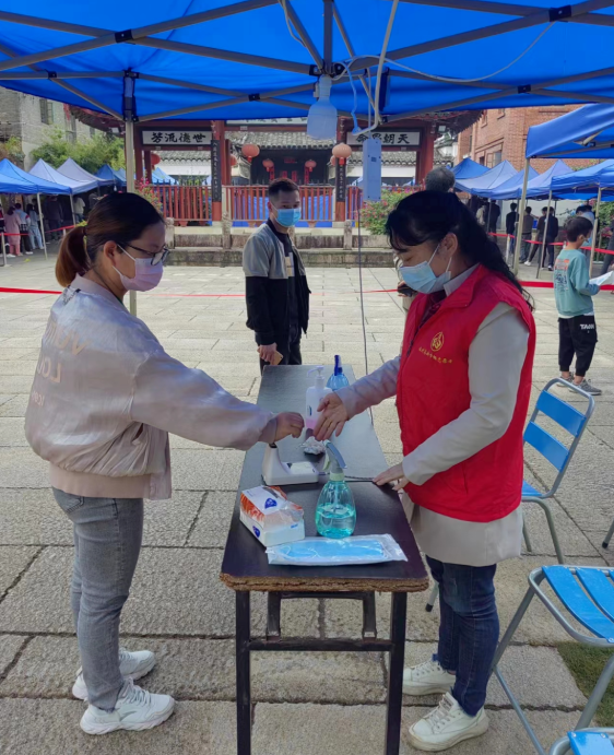 ▲陈丰娟(右一)在核酸检测点为群众测温